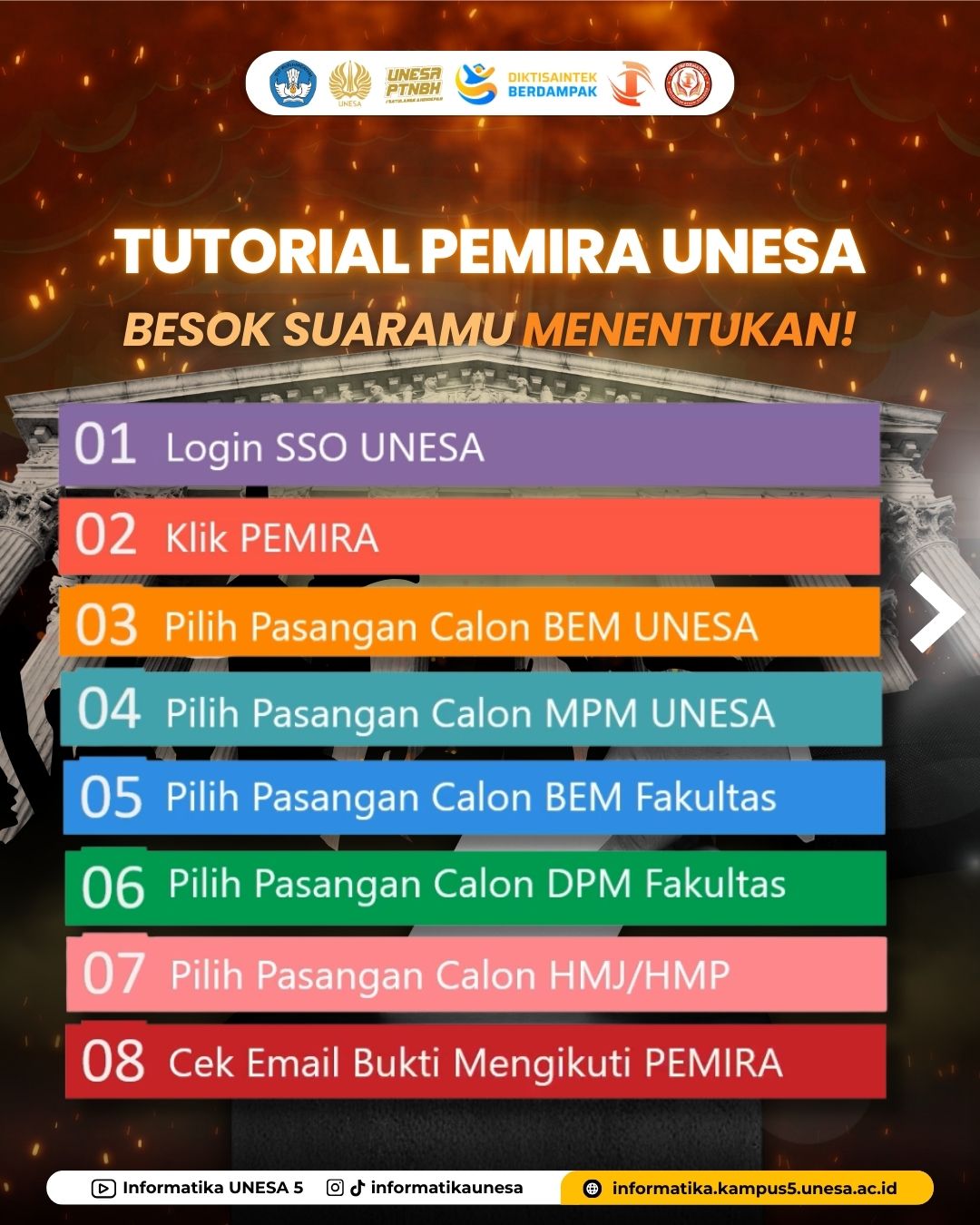 Berdasarkan informasi resmi yang disampaikan melalui media publikasi, akses Pemira dilakukan melalui menu SSO UNESA > Kemahasiswaan > Pemira. Seluruh mahasiswa yang memiliki hak pilih diharapkan mengikuti setiap tahapan dengan cermat agar proses pemilihan berjalan lancar.